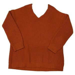 This is a women's preowned Poof Apparel pullover sweater in excellent condition, size L. It's a rust brown pullover sweater with a V-neckline, long sleeves, and made from a cotton blend knit fabric. The sweater has a regular fit and is suitable for casual wear.