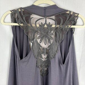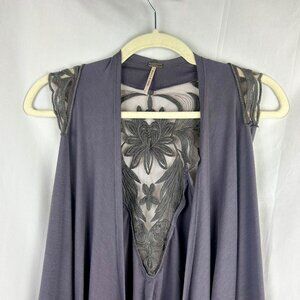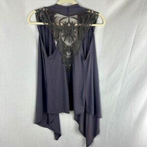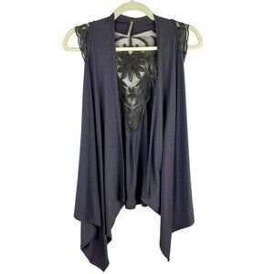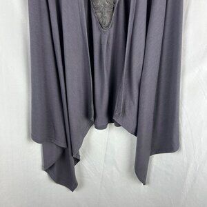 Poof Boho Festival Lace Vest Women Large Gray Knit Assymetrical Hem Open Front