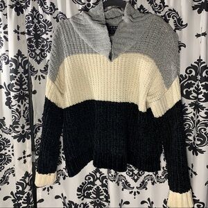 Stay warm n cozy in this adorable black, white and gray color block style sweater!