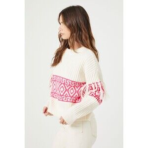 A ribbed knit sweater featuring a crew neck, dropped long sleeves, geo design, and tassel fringe trim