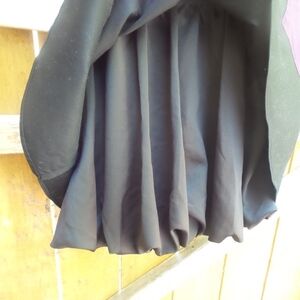 Dance floor ready party dress. Round neck black dress with pop of color red and purple. Poof mini dress size small. Faux back buttons zipper side closure