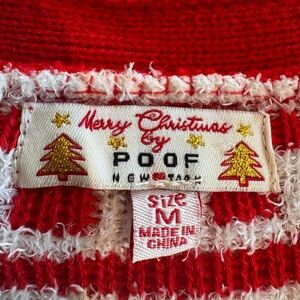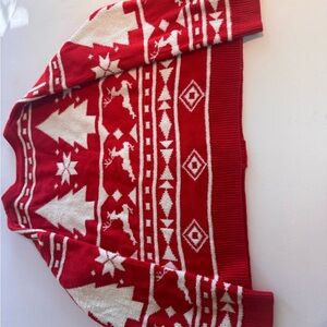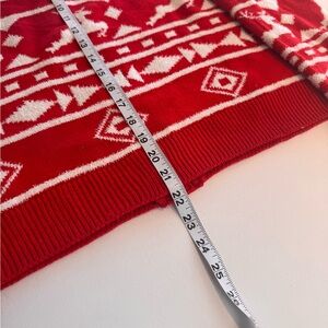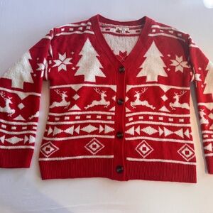 Vintage Cozy and festive button-up cardigan from Poof New York. Features a bright red and white holiday Fair Isle pattern with reindeer, snowflakes, and Christmas trees. Perfect for Christmas parties, ugly sweater events, or just spreading holiday cheer!