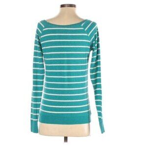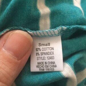 Experience maximum comfort with the Poof! Pullover Sweater in size small. This stylish piece features a striped print in teal and white, perfect for casual or formal wear. Made with a blend of 92% cotton and 8% spandex.