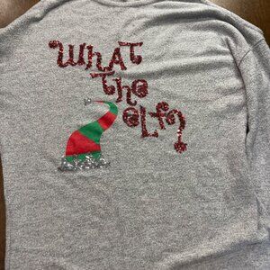 Poof 'What the Elf' Sweater JUNIORS Size Large Ugly Party Holiday Christmas Gray