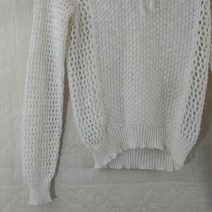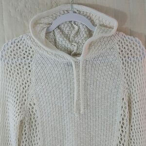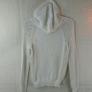 Poof! Women's White Long Sleeve Crochet/Knit Pull Over Hoodie Top. 60% Cotton,35% Rayon, 5% Spandex. Drawstring Hood. Cable Knit Cuffs/Hem.Transparent With No Lining. Shoulder Stretch Mark From Hanging. Measurements approx. Flat Lay. Pit to Pit: 16.5, Sleeves: 27, Hood: 13, Length: 21, Hem: 11 Size Medium. Color May Vary Due To Lighting.
