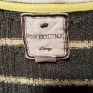 Very pretty gray and white striped ladies long sleeve pullover sweater. poof excellence brand. V neck. Gathered at waist.