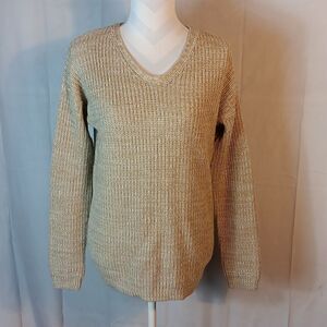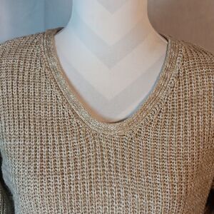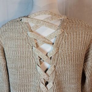 This taupe colored long sleeve with corset back Poof Apparel crocheted sweater is a size XL with a pit to pit measuring 23" and a length of 25". In excellent condition. All offers are welcome.
