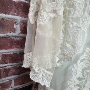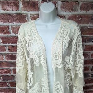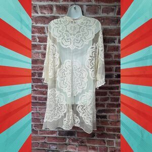 poof new york kimono, embroidered mesh robe, floral sheer layer small, cream boho beach cover up, lightweight summer kimono, poshmark festival fashion, mesh floral cardigan, kimono robe jacket, small cream embroidered wrap, soft breathable layering piece