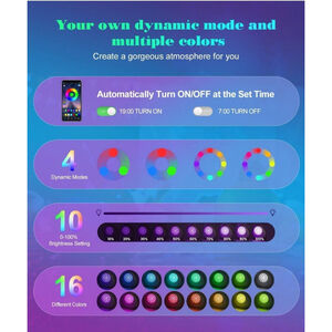 Bluetooth App & RF Remote Control By scanning and downloading the cell phone APP intelligent control of LED lights color brightness, color temperature, you can also set up a variety of fancy flashing mode, you can also make the LED lights with the rhythm of the music for the rhythm. And connect one or more LEDs via Bluetooth to realize various settings and controls for multiple LEDs. The RF remote control can also be used to adjust
