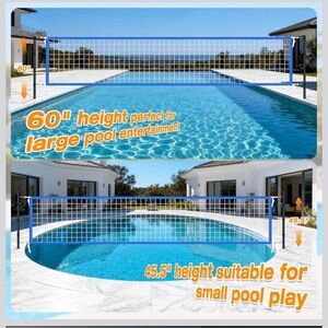 Pool Volleyball Net Set Adjustable Length and Height, Compatible with 3 Universal Floor-Mounted Bases, Includes 2 Inflatable Volleyballs