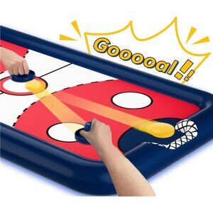 🧿【Pool Toy Playset】 Includes 1 inflatable waterproof slide hockey table, 2 navy blue colored pushers, and 1 yellow colored puck.