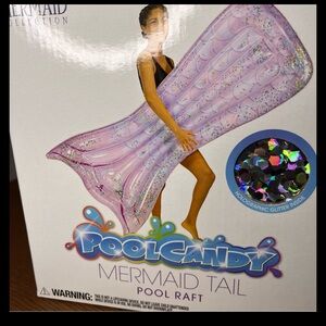 Enjoy the pool with this PoolCandy Mermaid Tail Pool Raft. Features a holographic glitter design in pink and purple.