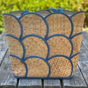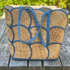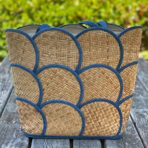 Poolside Denim Trim Scallop Straw Wicker Tote Beach/Bag. Good condition with a small amount of wear but lots of life left. Minor unraveling on one side and minor spots on one upper corner (see last three photos). All handles are attached but three are missing a stitch - easy fix. Ships from a smoke and pet free home.