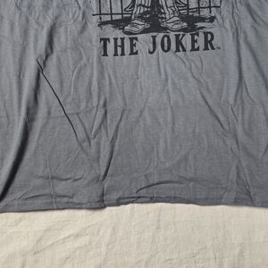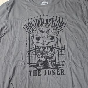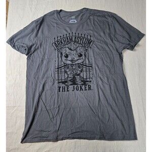 This is a men's size XL gray t-shirt featuring a Joker design from the Pop Batman Arkham Asylum brand. It has short sleeves, a crew neck, and is made of cotton. The shirt includes a colorful logo accent and belongs to the Batman character family. This collarless tee is suitable for all seasons and has a regular fit.