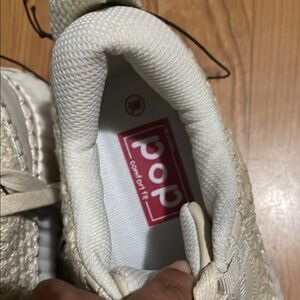 Experience the perfect blend of style and comfort with these Pop sneakers, featuring a unique woven texture in cream and white. The thick, platform-like rubber soles provide a modern touch, while the traditional lacing system ensures a secure fit. Ideal for casual outings, these sneakers offer a chic and versatile look.