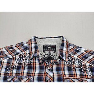 Add some western flair to your wardrobe with this Pop Icon button-up shirt. Featuring a plaid pattern and embroidered accents, this shirt is perfect for any casual occasion. The short sleeves and slim fit make it comfortable and stylish, while the collared neckline and pearl snap closure add a touch of sophistication. Made from high-quality cotton knit fabric, this shirt is sure to last. Available in XL size, this shirt is a must-have for any fashion-forward man.