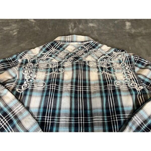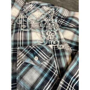 This Pop Icon Clothing button-up shirt is a must-have for any fashion-forward man. With its embroidered accents and plaid pattern, it's perfect for any occasion, whether it's a casual day out or a formal event. Made from lightweight and breathable cotton fabric, it's easy to care for and suitable for all seasons. Featuring a collared neckline and a regular fit, this shirt is designed for comfort and style. It also comes with convenient pockets and a button closure. Whether you're going for a western, cowboy, or outdoor theme, this shirt is sure to impress. Available in size XL, it's a great addition to any wardrobe.