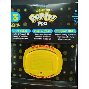 Pop It! Pro is an engaging light-up fidget game designed for ages 5 and up. It features three exciting game modes: Pro Mode, Pop & Pass, and Poppin’ Blitz, offering variety and challenge for 1 or more players. The interactive design tests reaction speed and memory skills, with each level becoming progressively faster. The device is easy to operate with an intuitive press-to-power-on feature and includes batteries for demonstration purposes. Lightweight and portable, it’s perfect for at-home entertainment or on-the-go fun.
