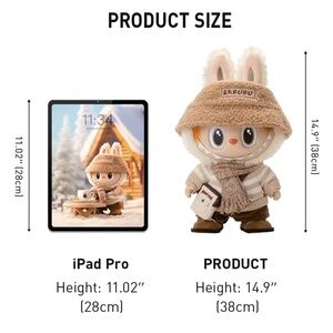 The Pop Mart Labubu The Monsters Dress Be Latte Vinyl Plush Doll stands about 15 inches tall. It is made of ABS/PVC plastic, and its face and ears are enhanced with fur-like material. It is part of Pop Mart's The Monsters series, a fairy tale created by toy designer Kasing Lung. The story has several characters, including Labubu.