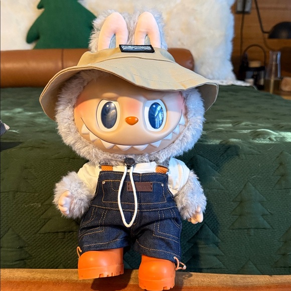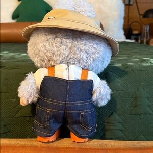 Adorable plush toy with a tan hat and denim overalls. Features fluffy gray fur and big blue eyes.