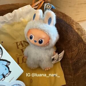 Light blue plush keychain from the Pop Mart Pin For Love series featuring the letter “D.” Confirmed open box, brand new and never used. Includes plush pendant, keyring, original letter “D” sticker card, drawstring pouch, silica packet, and box opened from the bottom. Authentic and highly collectible—adorable Labubu character in soft blue bunny suit with embroidered details. Ideal for collectors or gifting.