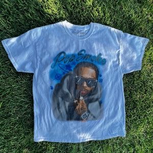 Printed with an airbrushed-style design of the rapper with his name above with ephemeral sparkles all around. Reminiscent of those handmade tees you'd buy at the fair every summer.
