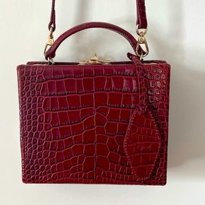 Pop & Suki deep red croc embossed mini bag. Long straps detach can carry by short handle or wear over the shoulder. There are makeup stains on the interior - I haven’t tried to get them out but they may come out with professional cleaning.