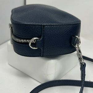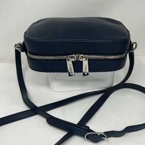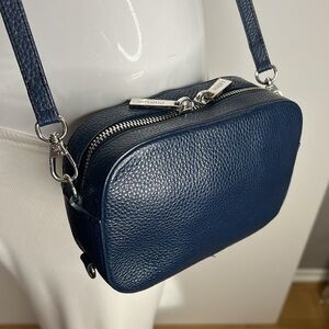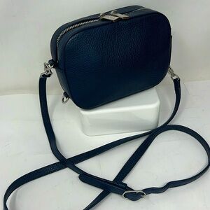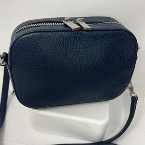 This is a beautiful Pop & Suki Pebbled Blue Vegan Leather Crossbody Bag. Upper and lower D rings to wear either way. Adjustable shoulder crossbody strap. Double zipper opens to a single lined compartment. Interior lining shows minor scuffs from normal wear. Minor scuffs from storage essentially unseen. 6.75” x 4.5” x 2” with an detachable adjustable 24” strap. No odors.