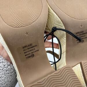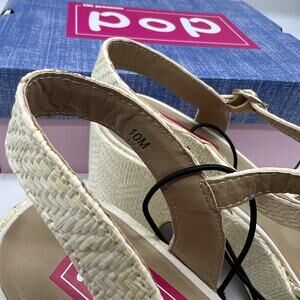 Pop Womens Applaud Heeled Sandals Natural Cream Color ● New Very Good Condition - See Photos ● Color: Natural Cream ● Size : 10 ● Features: Cut Outs ● Closure Type: Buckle ● Footwear Technology: Foam ● Platform Shoe Height: 1 1/2 Inches ● Shoe Heel Height: 4 1/4 Inches ● Upper/Outer Base Material: 100% Polyurethane ● Shoe Lining Material: Polyurethane ● Sole Material Content: 100% Unit Molded Polyurethane ● Toe Type: Open Toe, Square Toe ● Shoe Strap Type: Ankle Strap ● Heel Style: Block Heel These Pop women's Applaud heeled sandals are a warm-weather style showstopper. Made from textured fabric, this open-toe style has a 4.25-inch high heel, an ankle strap closure, and a split raffia front strap. Wear them with a dress or skinny-leg jeans and a blouse. Fast shipping (I Ship Daily) - Pet free - Smoke free I have over 1000+ additional unique items in my store/closet. Take a look. Let me know if you have questions. Thank you for supporting my small business.