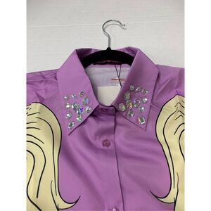 Ladies super cute purple multicolored button down short puff sleeve asymmetrical hem oversized statement blouse. Excellent condition. New with tags.