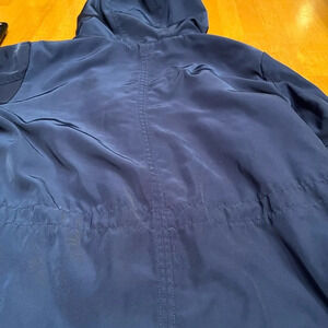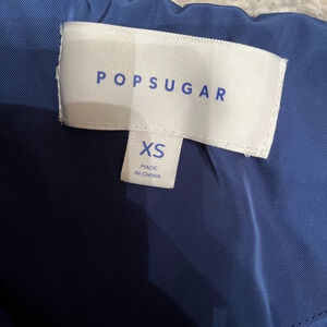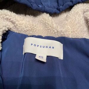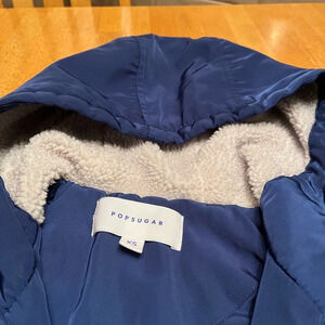 PopSugar jacket with Sherpa lined hood, size XS. This dark blue hooded very cozy jacket is 30” from shoulder to hem. The belt is missing but there are no holes, rips or stains.