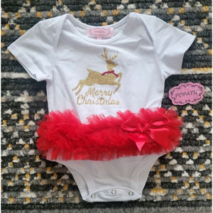 Beautiful baby girl short sleeve bodysuit, just in time for the holiday season. Merry Christmas golden lettering with a reindeer on the front. Great for pictures, photoshoot, unwrapping gifts, or any holiday / Christmas party / get together