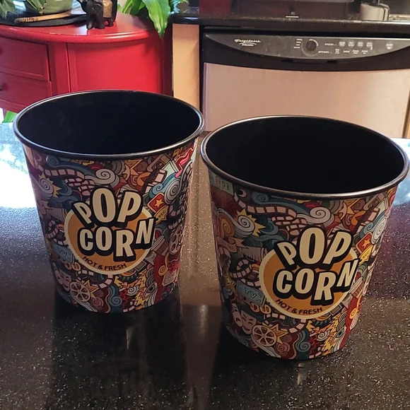 2 large popcorn containers for your in-home viewing room. Place your popped bag of popcorn into these containers or pour it directly into these plastic, reusable containers.