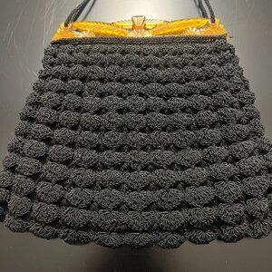 Popcorn Crochet Black Shoulder Purse With Celluloid Frame And Chain Vintage Boho