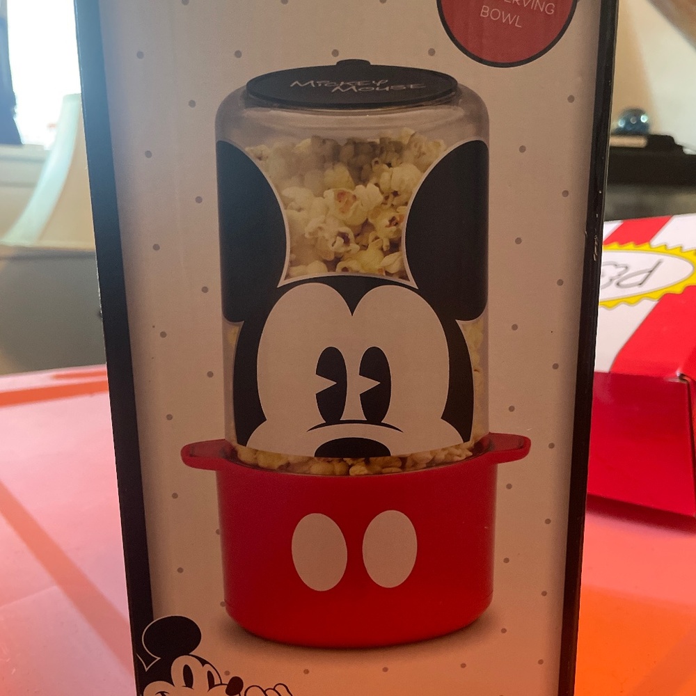 Brand new popcorn maker! Good sized Mickey Mouse popcorn maker. Comes with 2 different sized measuring cups. There’s holes on top of lid to melt butter or any seasonings into popcorn.