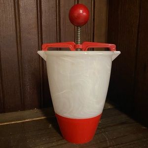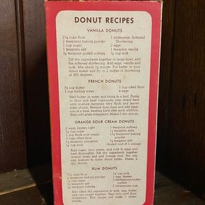 Donut maker from the 1960's made by Popiel in original box. Box is tattered and shows it's years in wear however its is still intact. The box is 7.75" tall and 3.75" square. The batter cup is made of plastic with an aluminum plunger and red wooden knob. Aluminum shows it's age a bit however as a whole the unit looks brand new. This piece of kitchen equipment would definitely bring a focal point to a vintage kitchen setting.