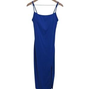 Popilush shapewear midi dress in royal blue. Spaghetti strap dress with built in shapewear and support for tummy control and smoothing. Dress features a side slit.