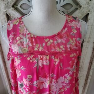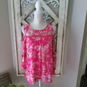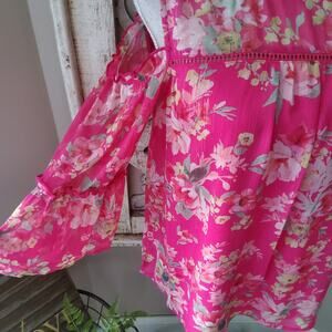 Pink floral with metallic to give it a shimmer, ruffle bell sleeve cold shoulder top by Poppi in a size small.