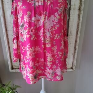 Grab this size small pink metallic floral cold shoulder 3/4 bell ruffle sleeve top now.