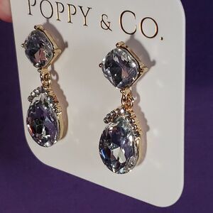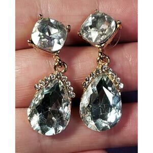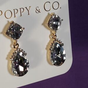 Poppy & Co. Clear Glass Rhinestone Crystal Teardrop Dangle Earrings, Yellow gold plated, NWT. These are gorgeous dangle earrings that drop about 1.5 inches. They have a large round clear glass rhinestone crystal on the top with a large teardrop clear rhinestone crystal dangling underneath. The teardrop is accented around the top with a line of pavé round clear rhinestone crystals. They are all set in a gold-plated metal, it tested at 10k (see last picture for acid test). These are new in the original package, on the card with soft white cloth bag.