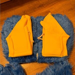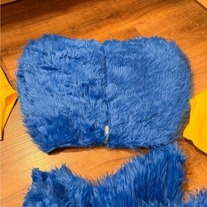 Fun blue furry monster costume with yellow accents. Features large eyes and a playful design.