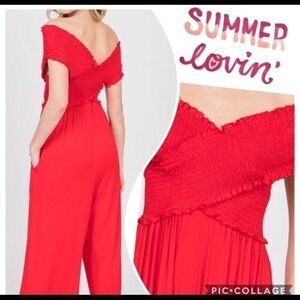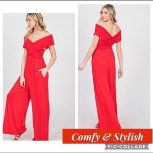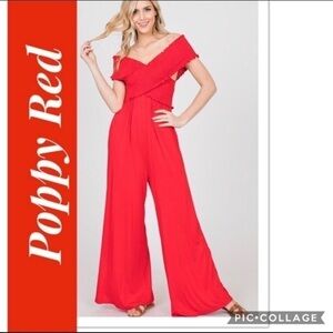 Poppy Red Jumper. Jumper has elastic upper half in which u can wear off/on shoulders. Wide Palazzo Pants. Runs big! Hot! 🔥🔥