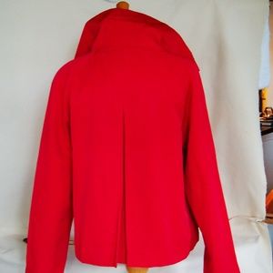 This poppy red zip front swing back jacket is one of the cutest I've posted. Great for vacations, boating, or casual outings. It is lightweight, practical and lined, with zip pockets on each side. Collar can be worn turned up, tightened with the drawstring, or left open for a casual look. Back has a long pleat adding to its sporty style. New condition. Luscious color.