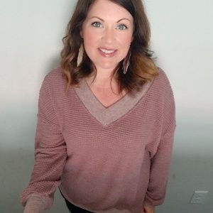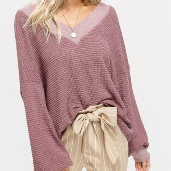 The Poppy Top is a v-neck waffle textured bell-sleeve top. It has a ribbed collar and cuffs. It can be dressed up or down, depending on your style that day. The Poppy Top fits true to size and the model is wearing a size small.