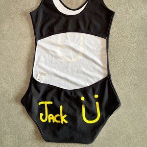 High quality leotard / bodysuit / one-piece swimsuit with happy face logo on front and "Jack U" on rear.