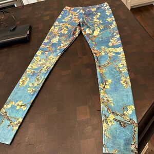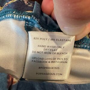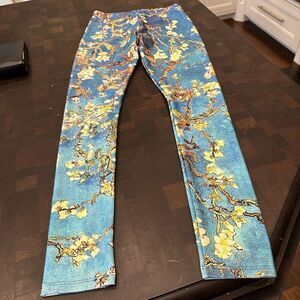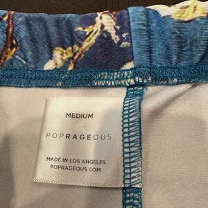 Poprageous blue and gold pattern, exercise workout leggings in size medium. Perfect condition made of polyester and elastane. The length is 36 inches and the waist is 25 inches. Elastic waist. The rise is 9 1/2 inches.