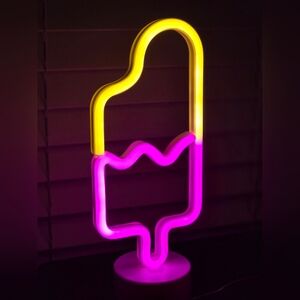 Popsicle Neon Sign for Bedroom, Desktop, Tabletop Decor - Battery Powered Popsicle Lights - Ice Cream Night Light Lamp with Stand- Pink & Warm White Led Signs. Batteries not included.