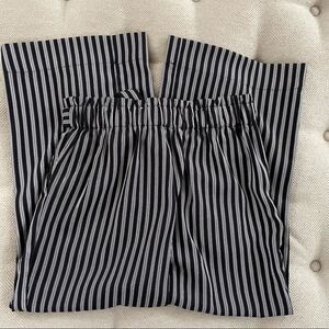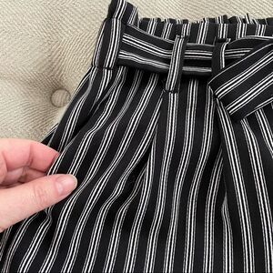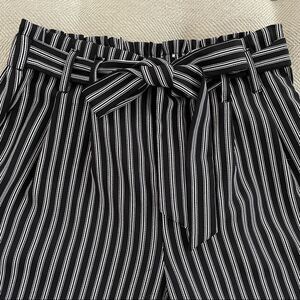 Pop sugar black with white stripes wide leg cropped pants with highways paper bag style with a coordinating attached sash. Measurements are approximate and taken while laying flat: 24 inch inseam and 11 inches straight cross the hem. 12.5 inch rise and 13 inches straight across the waist. 100% polyester.