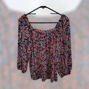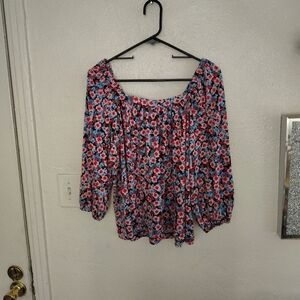 this is a pop sugar large top pink blue multicolor floral pattern short sleeve 3/4 in inch sleeve for sale. ADD THIS SHIRT TO YOUR CLOSET AND MAKE AN IMPRESSION. THIS IS A FLORAL ROMANTIC VINTAGE FEMININE SOFT WHIMSICAL DELICATE OFF THE SHOULDER. 20" SLEEVE, 20" FROM PIT TO PIT, 25" FROM THE TOP TO THE BOTTOM OF THIS BLOUSE. SIZE LARGE MADE IN CHINA MADE BY POP SUGAR, 95% POLYESTER, 5% SPANDEX, RN#73277, MACHINE WASH COLD GENTLE CYCLE, TUMBLE DRY LOW AND TAKE BLOUSE OUT IMMEDIATLEY AFTER DRYING IN DRYER. IRONING IS OK ON LOW. ADD THIS FESTIVE PIECE TO YOUR WARDROBE TODAY. SALE