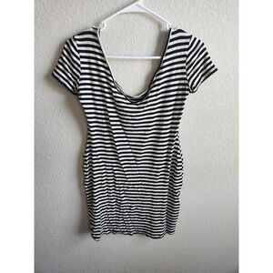 Popular Basics Womens Sz L Ribbed Mini Dress Wide Shoulder Black White Striped Y